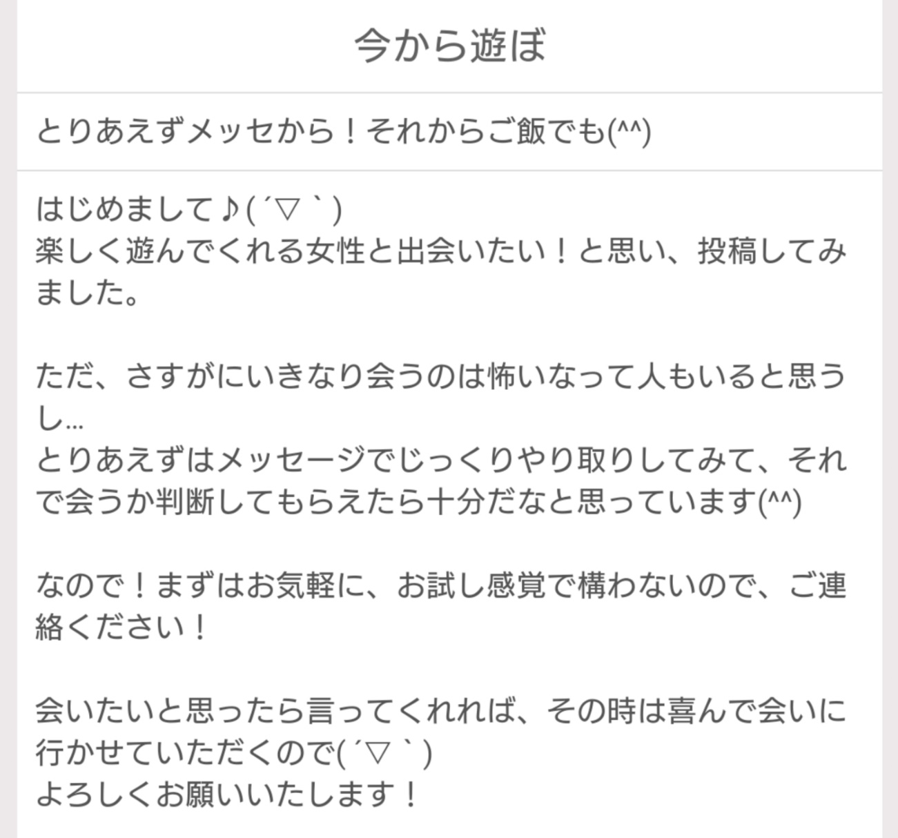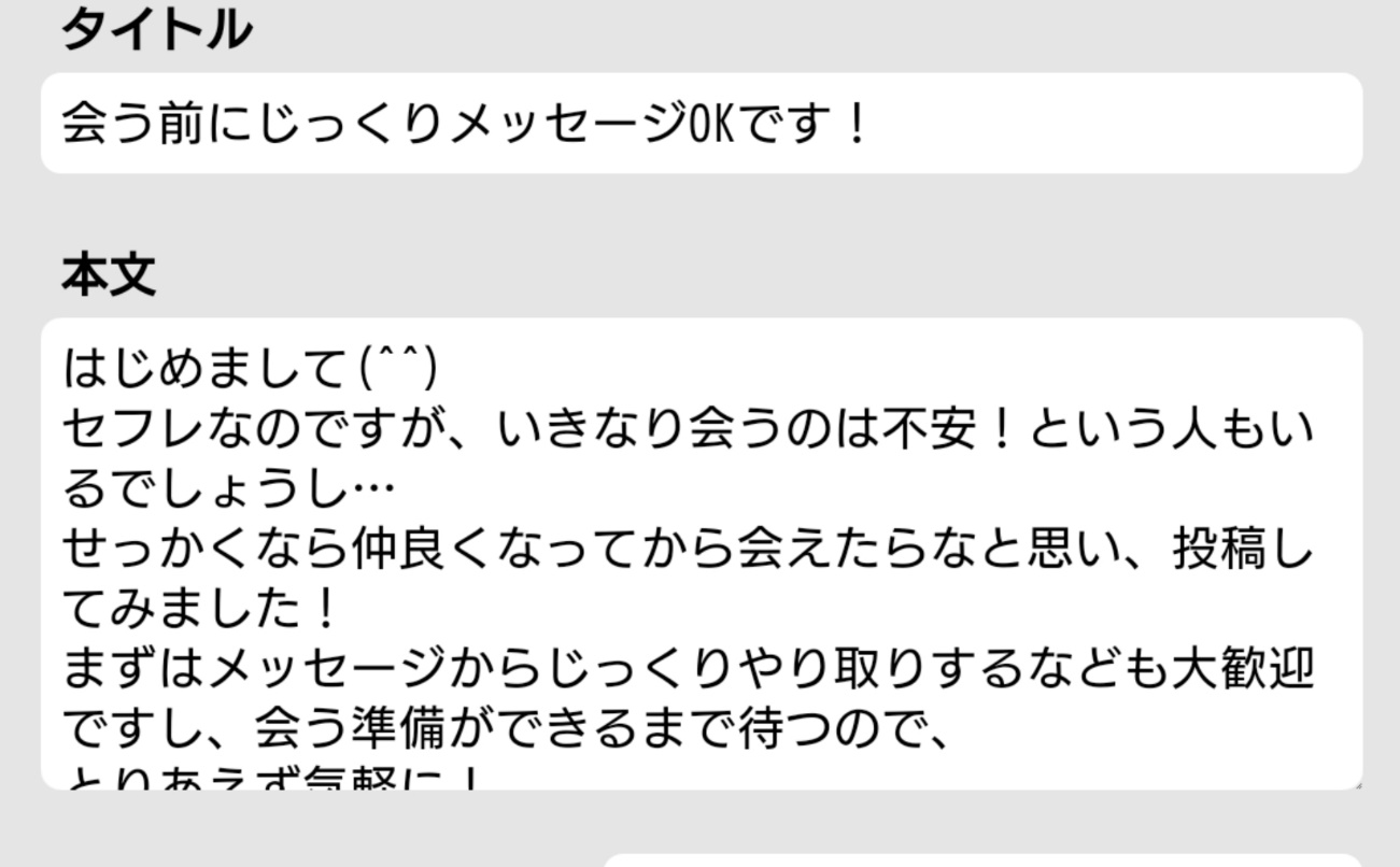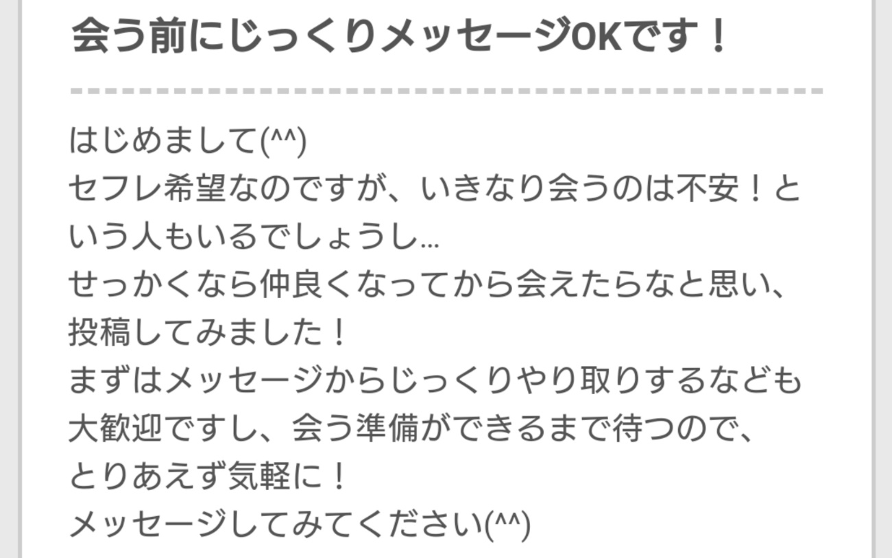 私が募集に反して「即会いを求める」ことがあれば、信頼を失っていた可能性があるとわかりますし、「誠実な印象のある相手を求めている」こともわかります。