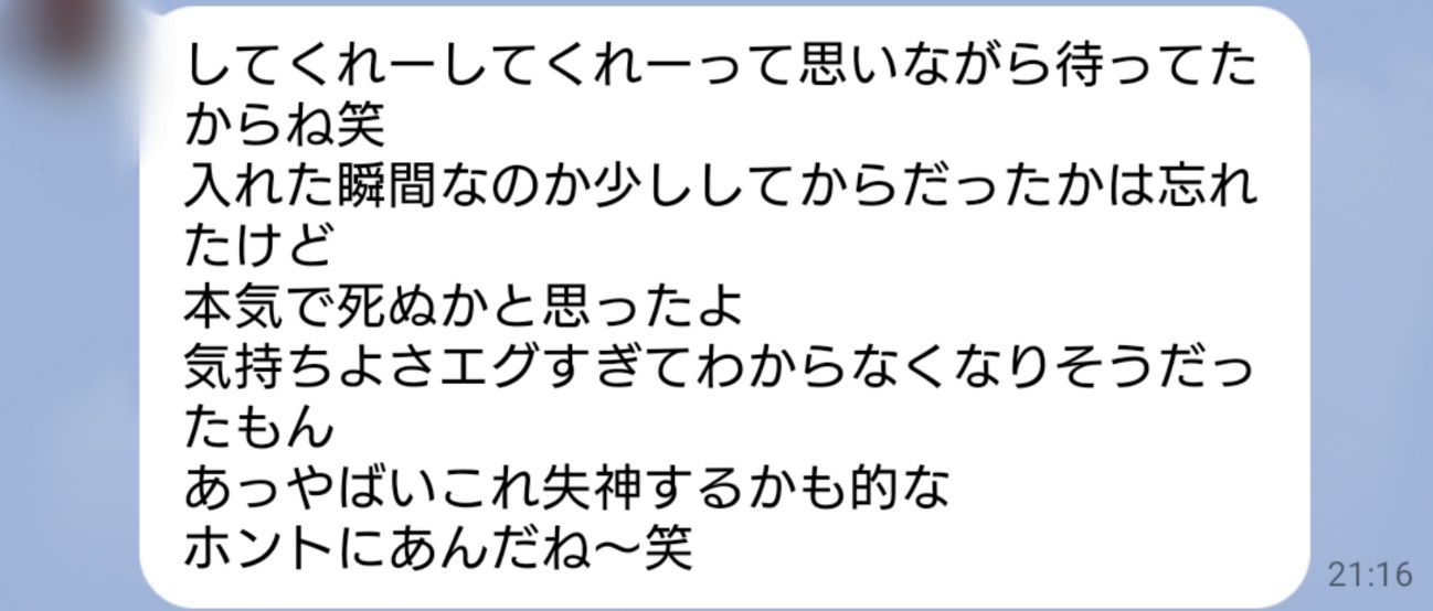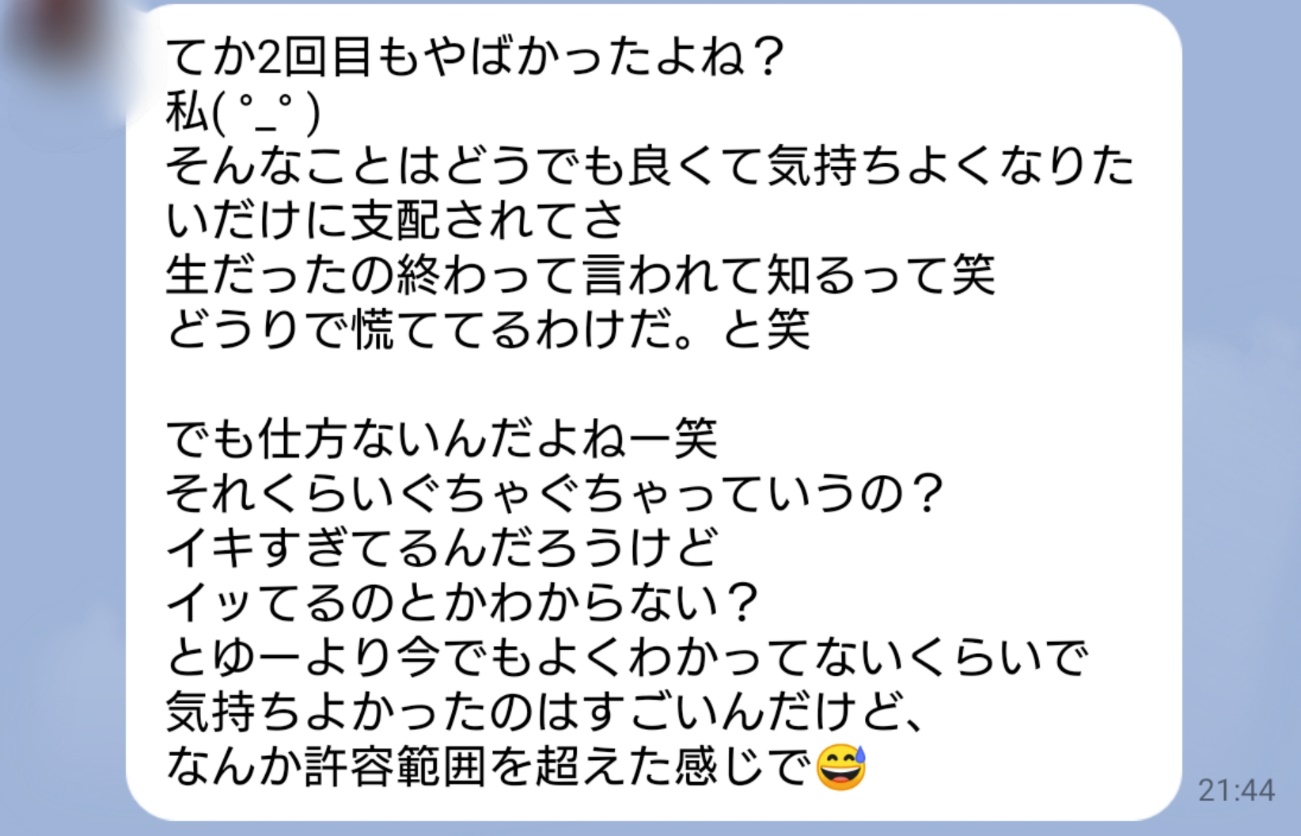 また、2回戦に関しては生での挿入で、「そんなことはどうでも良くて気持ちよくなりたいだけに支配された」らしく、むしろ私が犯されているような感覚だったのですよね(笑)。