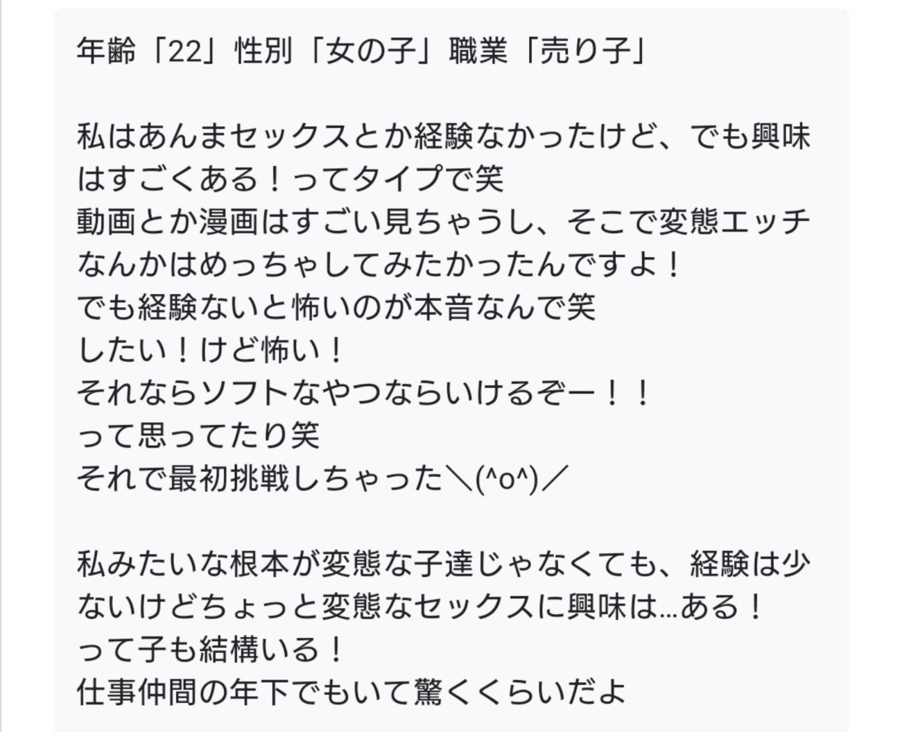 | 同8位:複数人プレイ | ・人数や比率次第ではハードだけど、女性が2人、男性が1人の3Pなら、ギリソフトだと思ったから。 ・女性の方が多いなら、思ったよりも恥ずかしくなかったし、だけど興奮したので、ハードっていうよりはソフトかな?と。 | 12件 |