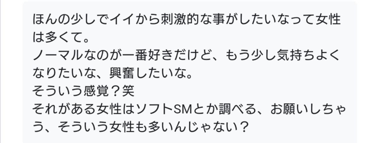 前提として、M気質の女性を中心に「ソフトSM好きな女性」から集めた意見ですが…