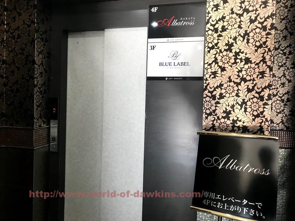 奥にエレベーターがあります。アルバトロスブルーレーベルは3Fですので、エレベーターに乗って3Fへと移動します。4Fは名前は似ていますが「博多アルバトロス」という全く別のお店ですので間違えないようにご注意下さい。