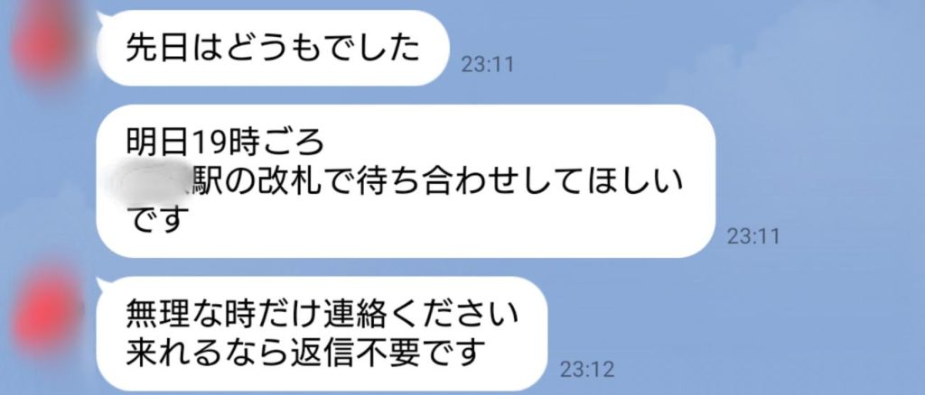 - 時間と待ち合わせ場所を指定され、その場所に来てほしいと言われただけ