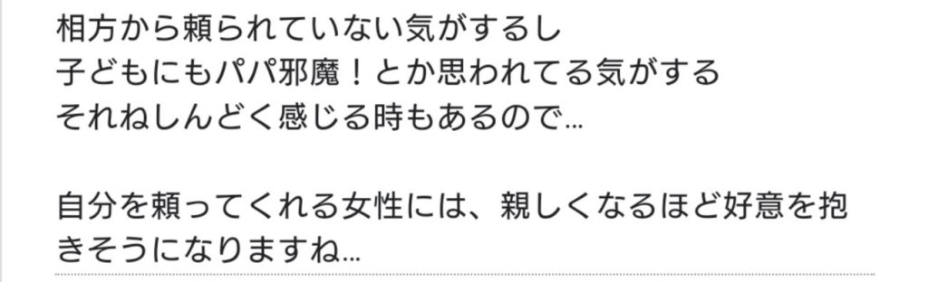そして、1番近くにいる異性であるはずの旦那が理解してくれないため、「聞き上手でイヤな顔もせず話しを聞いてくれる男性」は、旦那以上に行為を抱くこともあるそうです。